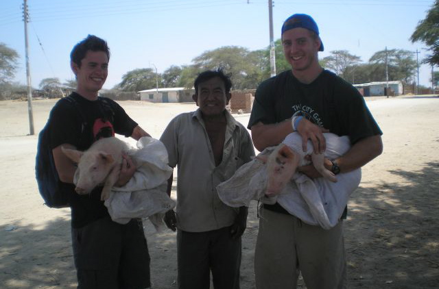 This man, who is crippled with arthritis, bought pigs with the loan he received from AYNI- pictured here with volunteers Chris and Chad.